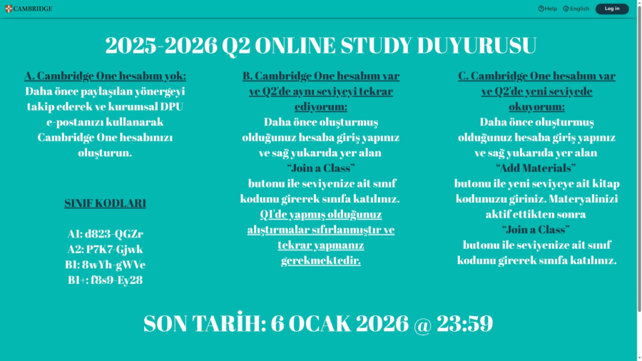 2025-2026 Eğitim-Öğretim Yılı Güz Dönemi'nde Cambridge kitaplarının çevrim içi alıştırmaları için sisteme ilk defa kayıt yapacaksanız kayıt işlemleri ile ilgili Bilgilendirme Formu'na ulaşmak için TIKLAYINIZ.